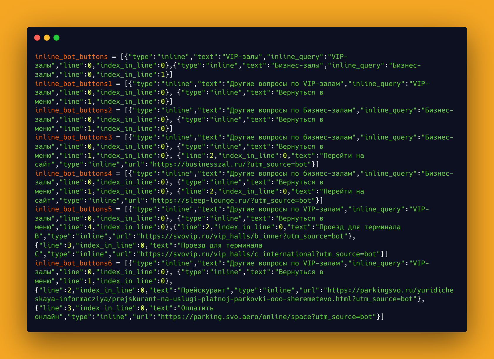 Мы согласовали бюджет с владельцем Группы Компаний Шереметьево и реализовали бот с помощью кода. Все ссылки размечены UTM-ками, чтобы собирать статистику, сколько людей пришло из чат-бота на сайт Шереметьево.